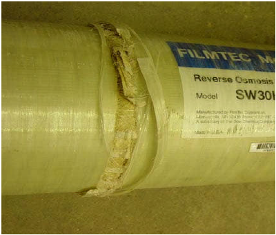 膜元件可能會遭遇稱為望遠鏡現象的機械損壞,膜元件的外包皮與膜元件錯開并移向下游,甚至套到下一支膜元件上,輕微的望遠鏡現象不一定會損傷膜元件,但嚴重時,可能會造成粘接線和膜片的破裂。