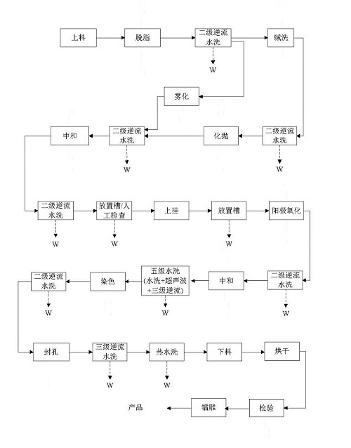 陽極氧化生產線工藝流程及產排廢水(W)示意圖