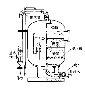 普通過濾器,粒徑小的濾料在上層,愈往下層粒徑愈大。水流自上而下地在濾層孔隙間進行過程中,雜質首先接觸到截污能力最強的上層細濾料,大顆粒懸浮物最先被除去,剩下一些小顆粒懸浮物被輸送到下一層。由于下層濾料比上一層要粗,其截留能力不足上一層,越往下層,這一現象愈加明顯。這種過濾,事實上會造成污泥絕大部分堆積在上層,導致局部阻力增長過快,總的水頭損失大。